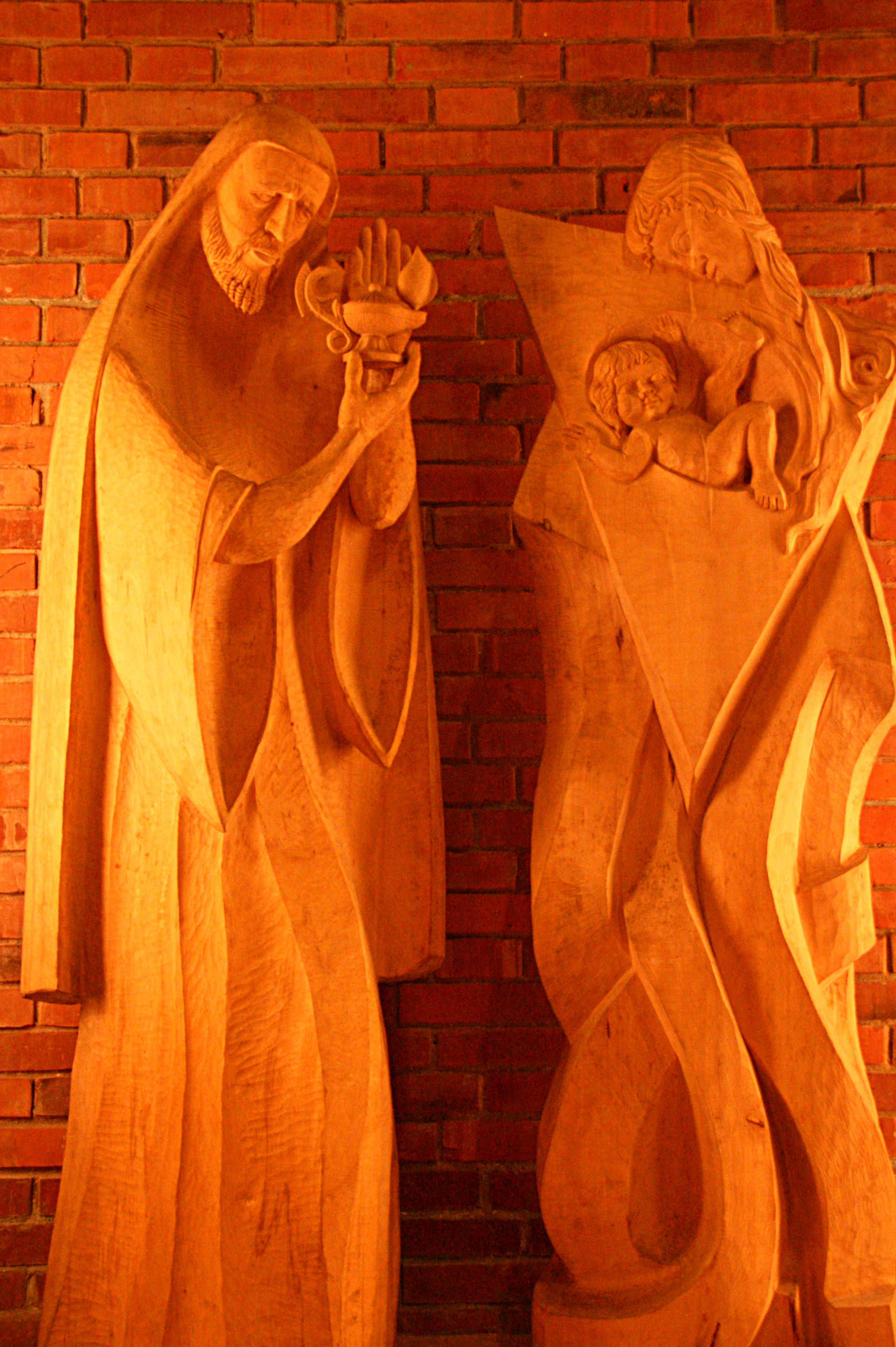 Sie sehen hinter dem Altar zwei Skulpturen. Das sind unsre Weihnachtsfiguren, Joseph und Maria. Joseph ist in traditioneller Weise gestaltet. Er wird in seiner Fürsorglichkeit für Maria und das Neugeborene gezeigt. In seiner linken Hand hält er ein brennendes Öllämpchen, ein Gegenstand, der Licht und Wärme spendet. Joseph ist der Mutter und dem Kind liebevoll zugewandt und füllt die Vaterrolle aus, ganz so, wie wir uns das vorstellen. Er hat eine vertraute, menschliche Gestalt.